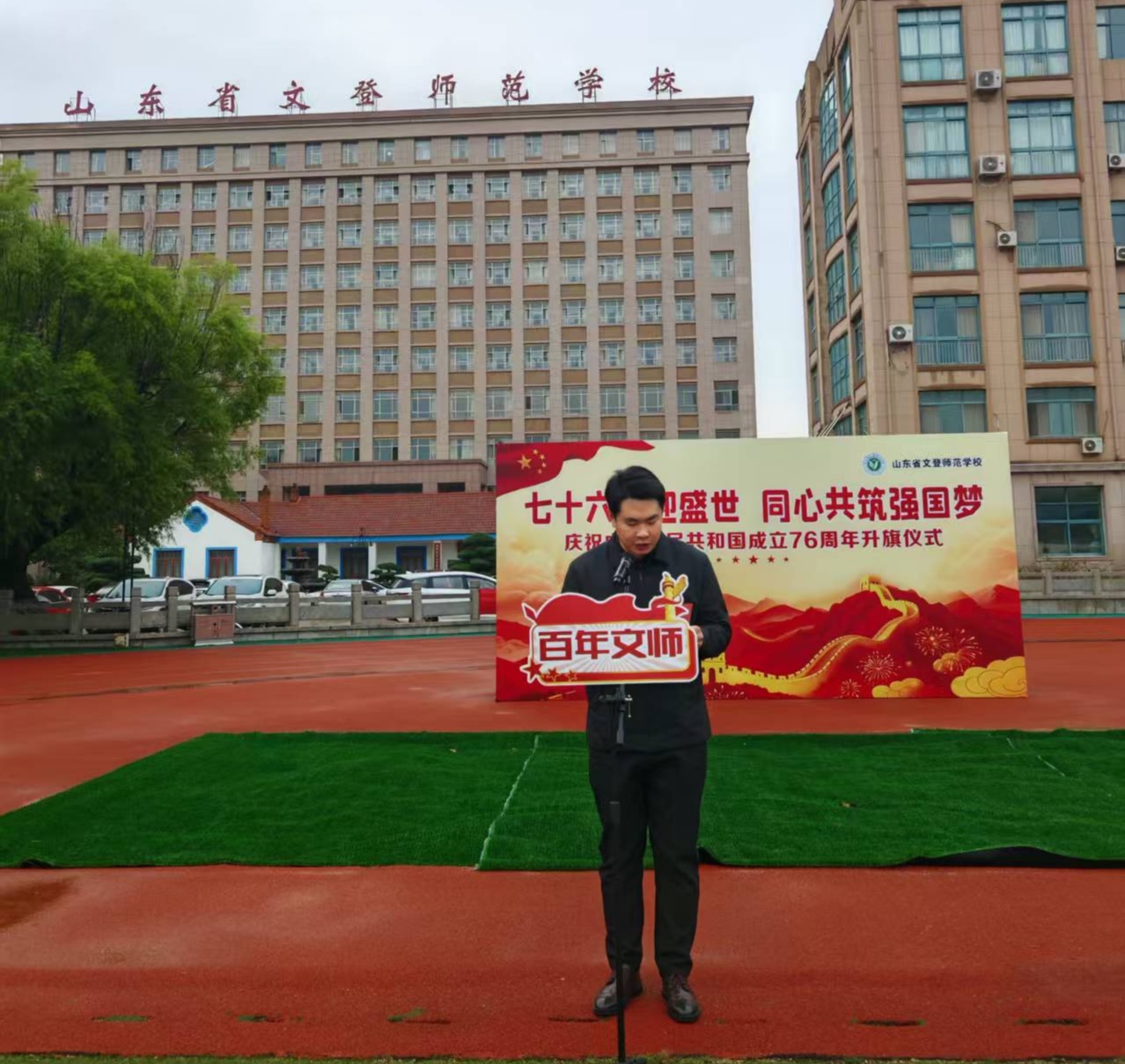 教师代表刘汝杰老师发言,他回顾了文师90多年的辉煌历程,将视角聚焦于教育事业的使命担当,呼吁全体教师不仅要做知识的传播者,更要做爱国主义精神的传承者,要以匠心守初心,用言传身教引导学生厚植家国情怀;同时勉励同学们将个人理想融入国家发展大局,在学习与实践中锤炼本领,成长为可堪大用、能担重任的栋梁之材。
