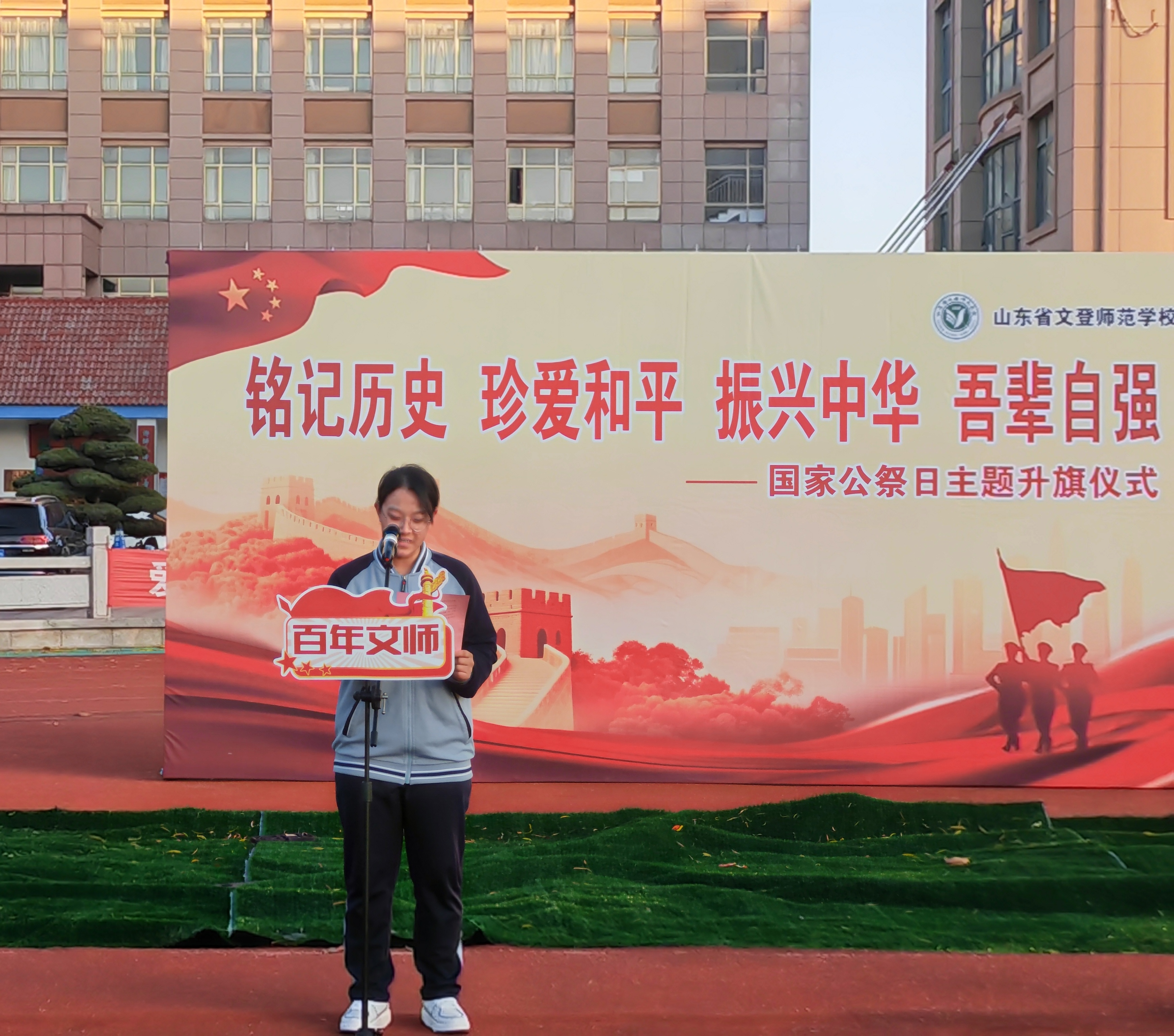 仪式旨在引导大家铭记历史、珍爱和平,以吾辈之自强振兴中华。教师代表高瑶老师勉励全体同学要铭记历史伤痛,传承先辈精神,于专业学习中锤炼本领,于品德修养中砥砺品格,以实际行动践行“强国有我”的青春誓言。国家奖学金获得者于文欣同学结合自身学习成长经历,呼吁同学们从历史中汲取奋进力量,珍惜当下和平环境,立志成才。